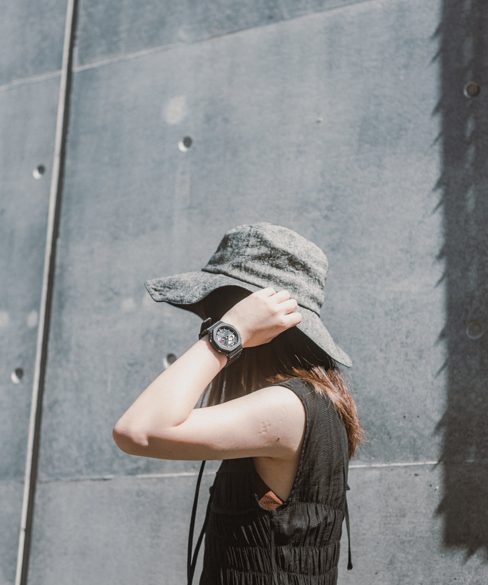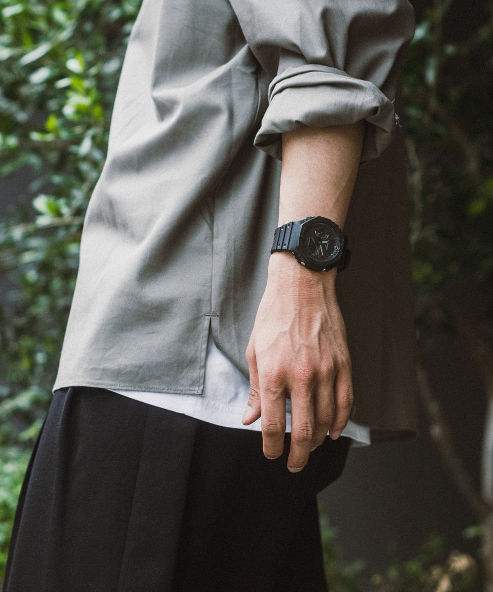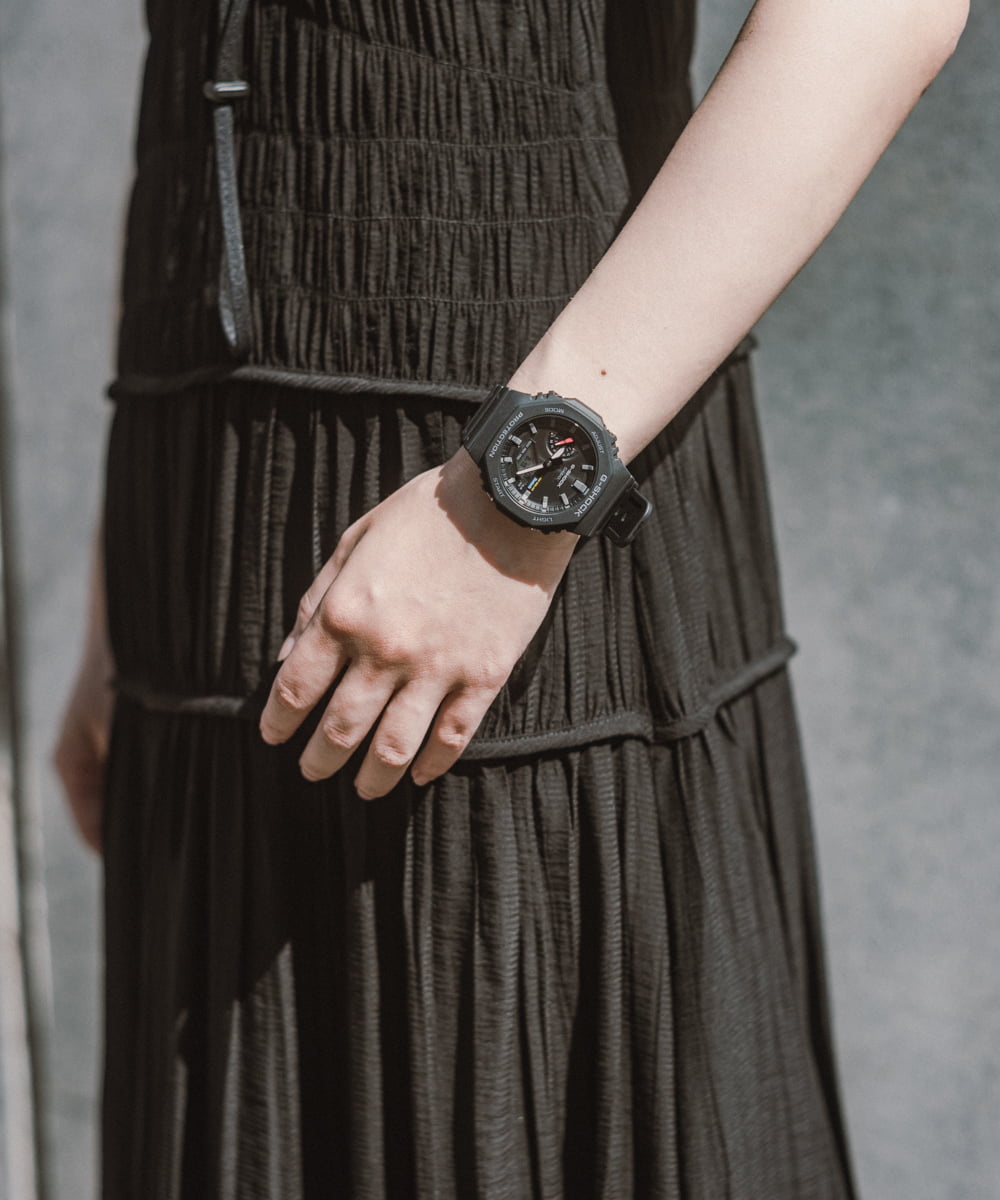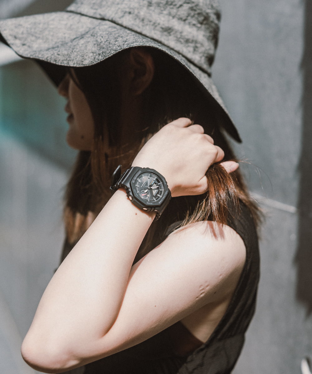 2100シリーズのコンセプトは『スリム & コンパクト』。DW-5000CとAW-500の2つのエッセンスを取り入れるとなると、どうしてもサイズが大きくなっても仕方ないと思いますが、G-SHOCKの先進技術が実現させた薄型モジュールやカーボンコアガード構造などにより、かなりコンパクトに収まっています。そしてコンセプト通りスリムなデザインに仕上がっているので男性の腕にはもちろん、女性にも合わせやすいボリューム感になっています。